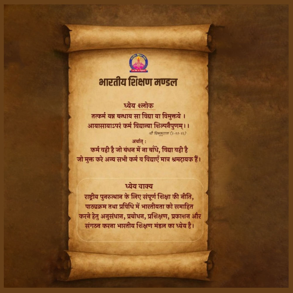 To evolve a completely Bharatiya system of education rooted in Bharatiya culture at all levels from primary to the higher education. Based on Bharatiya values with Bharat-centric Objectives, Policy, Curriculum & Pedagogy through a five-fold framework of Research, Awareness, Orientation, Publication & Networking and thus achieve a resurgent Bharat.