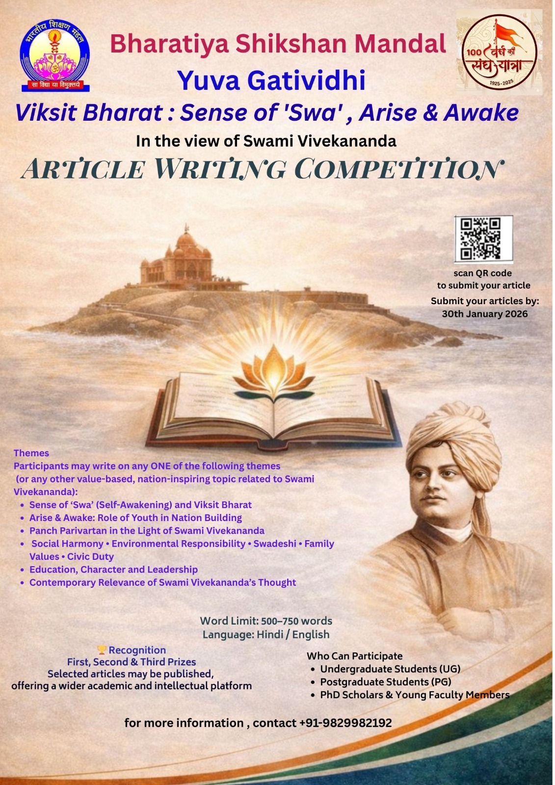 Bharatiya Shikshan Manal – Yuva Gatividhi organised Article Writing Competition in the view of Swami Vivekananda – Viksit Bharat : Sense of ‘Swa’, Arise & Awake.